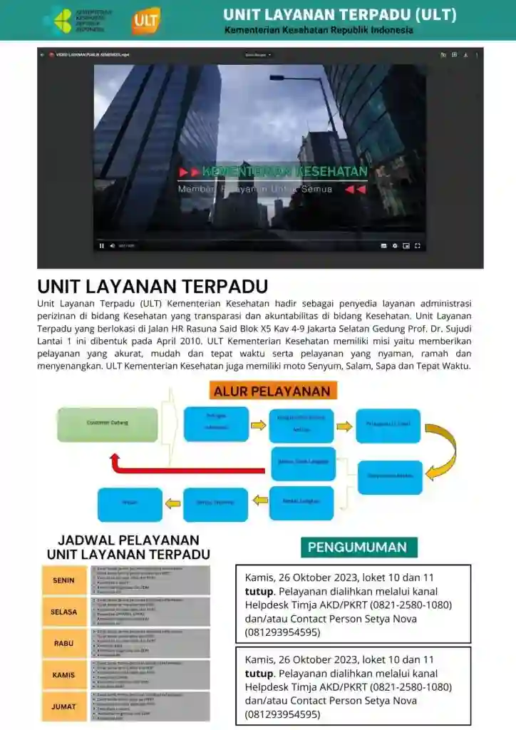 Unit Layanan Terpadu (ULT) Kementerian Kesehatan (Kemenkes) Republik Indonesia merupakan salah satu inisiatif strategis untuk meningkatkan efisiensi dan kualitas pelayanan publik di bidang kesehatan. ULT Kemenkes berfungsi sebagai pusat layanan satu pintu yang mengintegrasikan berbagai jenis layanan administrasi, informasi, dan bantuan teknis terkait program-program kesehatan kepada masyarakat, tenaga kesehatan, dan instansi terkait. Fungsi dan Layanan ULT Kemenkes menyediakan beragam layanan, termasuk: